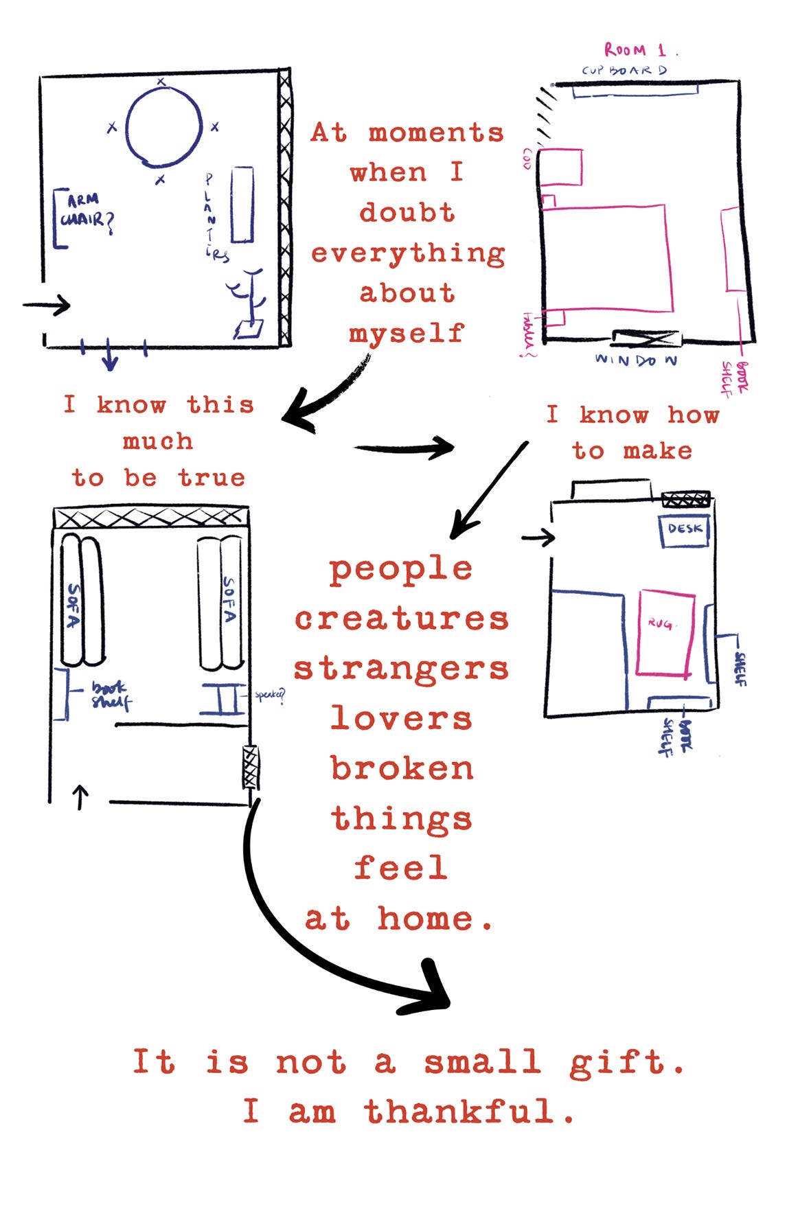 This week’s comic is called: Homebody. It’s about 20 homes and the search for one inside myself. The comic continues from where we left off last week, thinking about what constitutes home/familiarity and what alienation feels like. Think of it like a companion to last week’s comic, but not a sequel. You can scroll down to the end if you’d like to skip straight to the storytelling, or read on for some thoughts on Do Ho Suh, the South Korean artist whose work I went to see a few weeks ago.